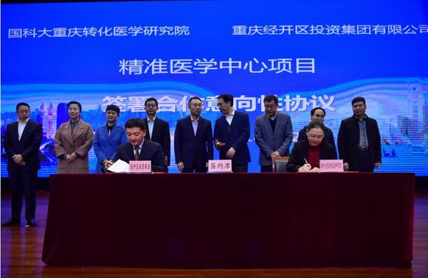 重庆经开区投资集团董事长尹友均与国科大(北京)健康管理有限公司常务副总经理、国科大重庆转化医学研究院副院长陈晓熠签署了精准医学中心项目合作协议。