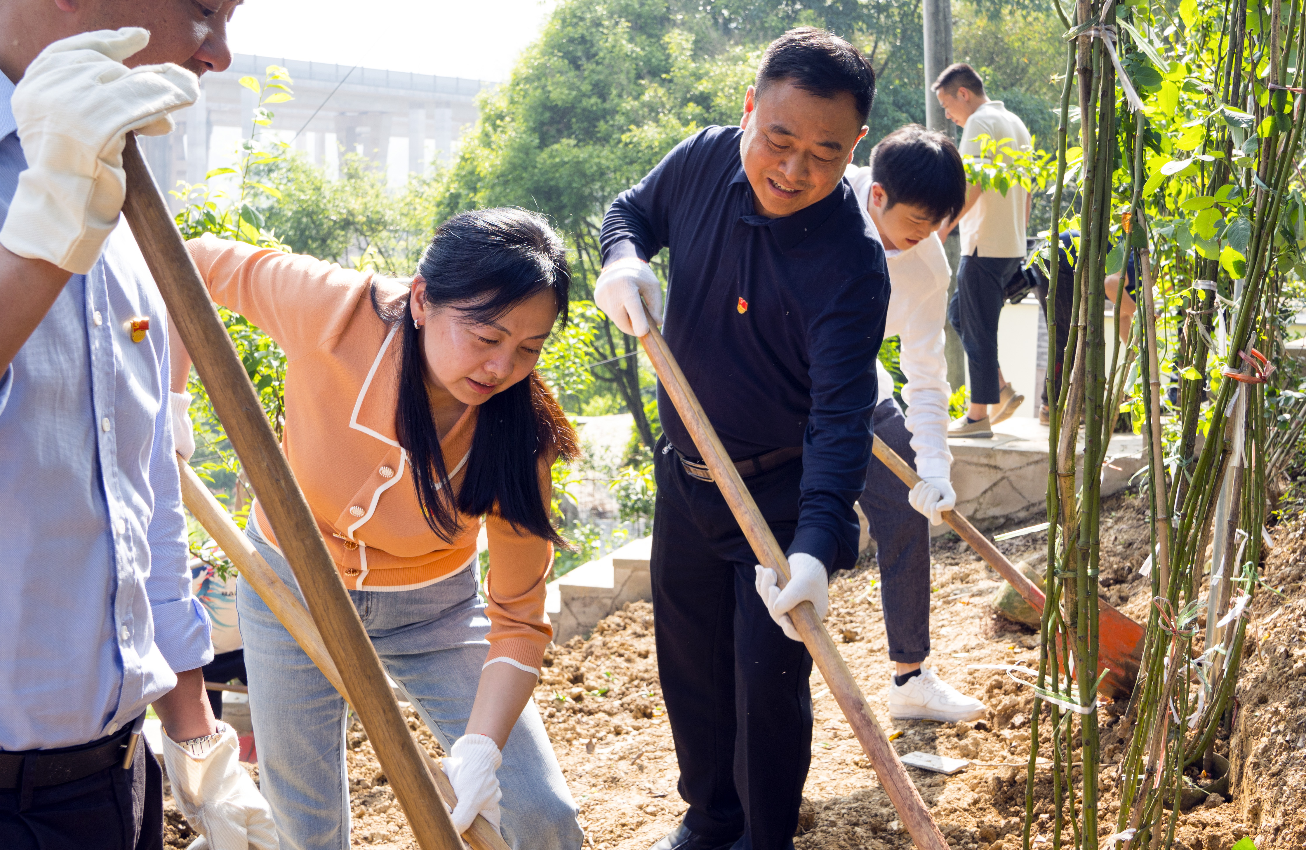 在“我为青山再添绿”志愿植树环节,公司党员同志们与村民一起,来到位于峡口镇兰草溪畔的农旅经济示范园,一边栽种树木花苗,一边沟通了解到当地农业园规划建设情况。未来一至两年内,这里将形成一片集花卉观赏、果树采摘和经济作物于一体的农旅休闲带。大家看到自己亲手栽种的近百株苗木花草整齐地排列,齐心聚力为之奋斗的生态城建设是那么具体而生动,自豪之情溢于言表。