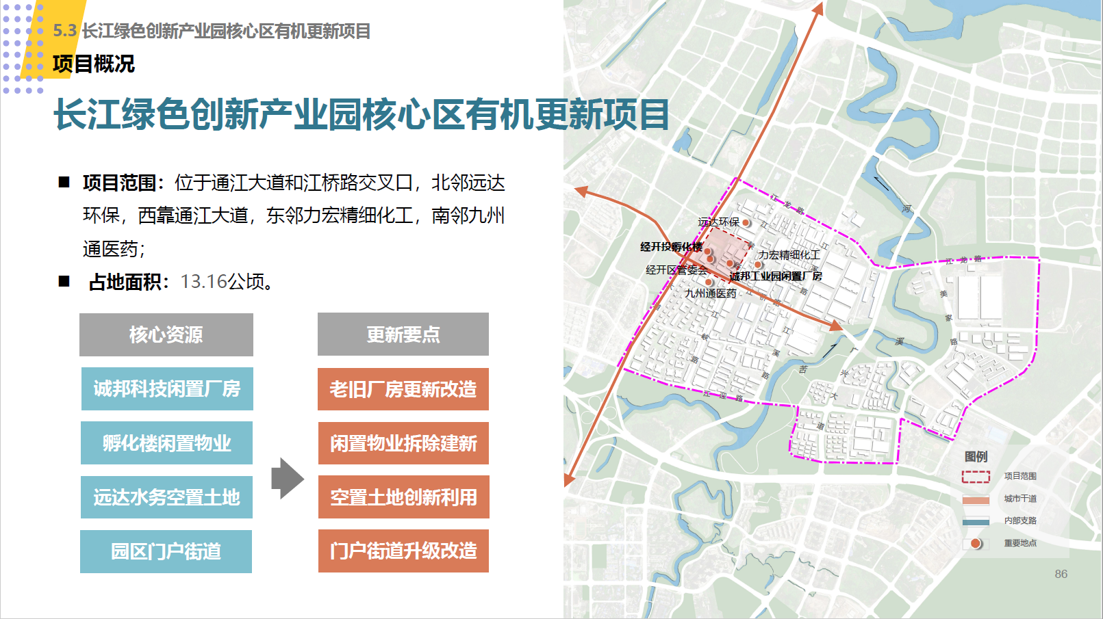 党的二十大报告提出,实施城市更新行动,加强城市基础设施建设,打造宜居、韧性、智慧城市。重庆经开区深刻领悟城市更新内涵要义,坚持系统谋划、高位推动、问题导向、破立并举,以《重庆市城市更新管理办法》为指引,以“推动高质量发展,创造高品质生活”为目标,统筹推进辖区城市更新工作,引导辖区存量空间增值提效。经开区管委会周边作为经开区重点推进的城市更新片区,定位为聚焦绿色低碳循环、碳达峰碳中和、“智慧+”“绿色+”主题,推进老旧厂区绿色转型,打造绿色产业示范基地。