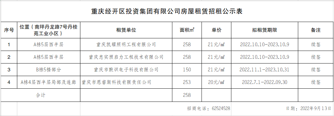 重庆经开区投资集团有限公司房屋租赁招租公示