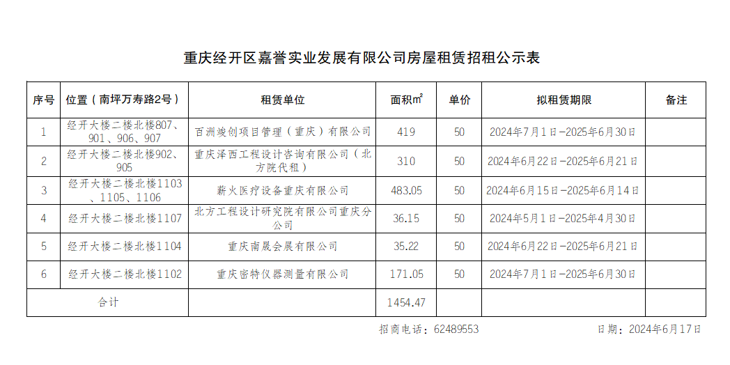 重庆经开区嘉誉实业发展有限公司房屋租赁招租公示