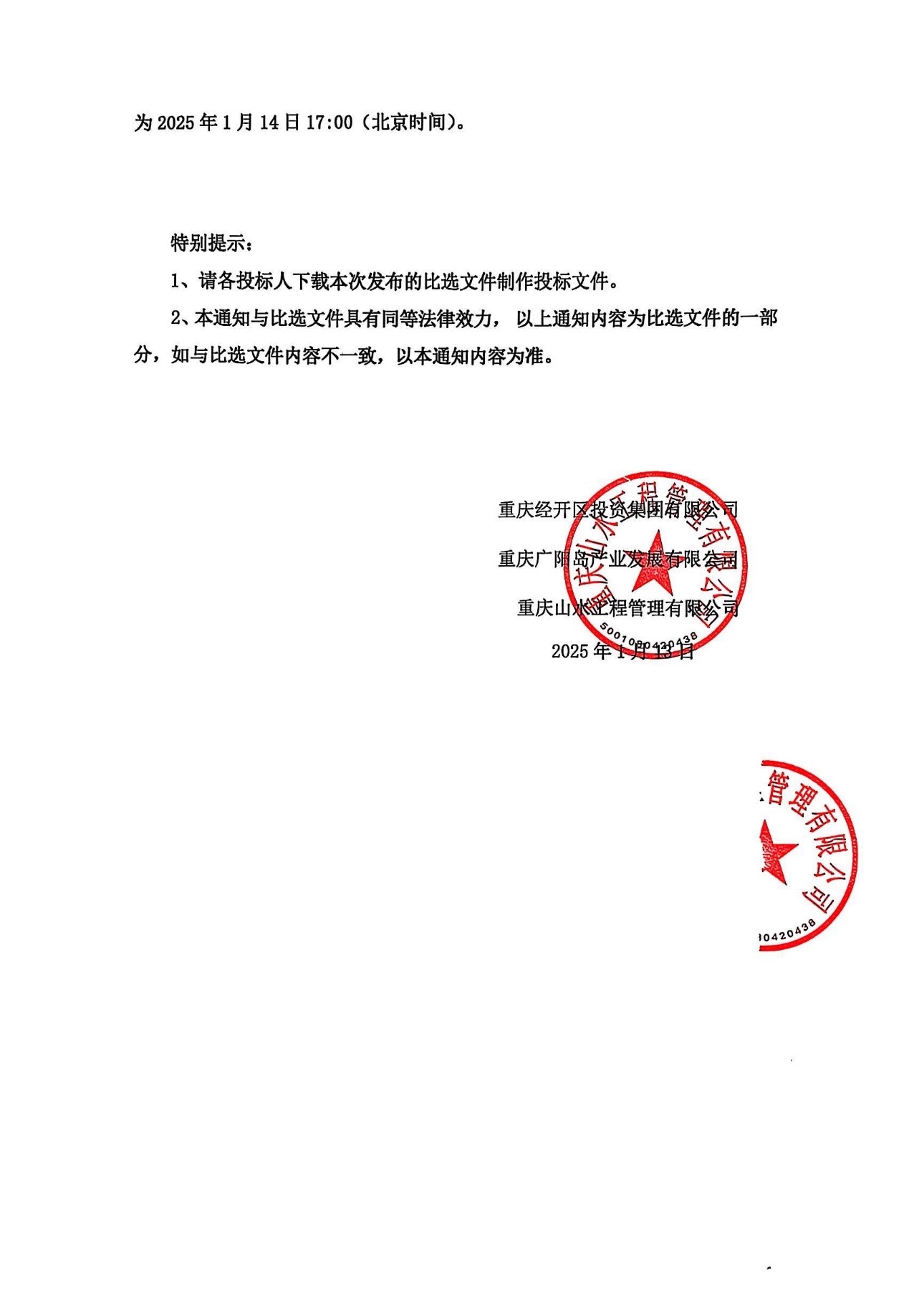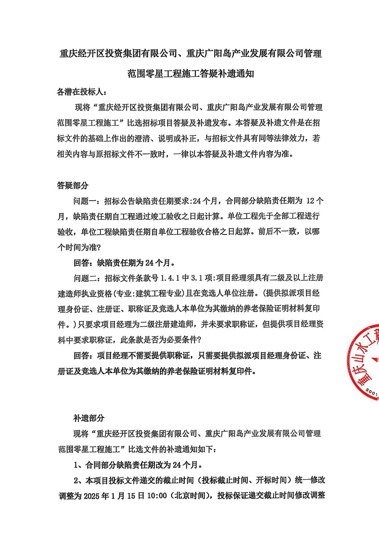 重庆经开区投资集团有限公司、重庆广阳岛产业发展有限公司管理范围零星工程施工答疑补遗通知