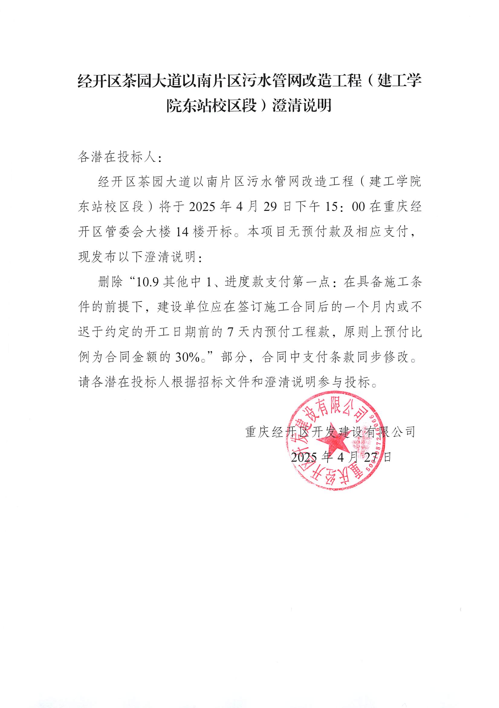 经开区茶园大道以南片区污水管网改造工程(建工学院东站校区段)澄清说明