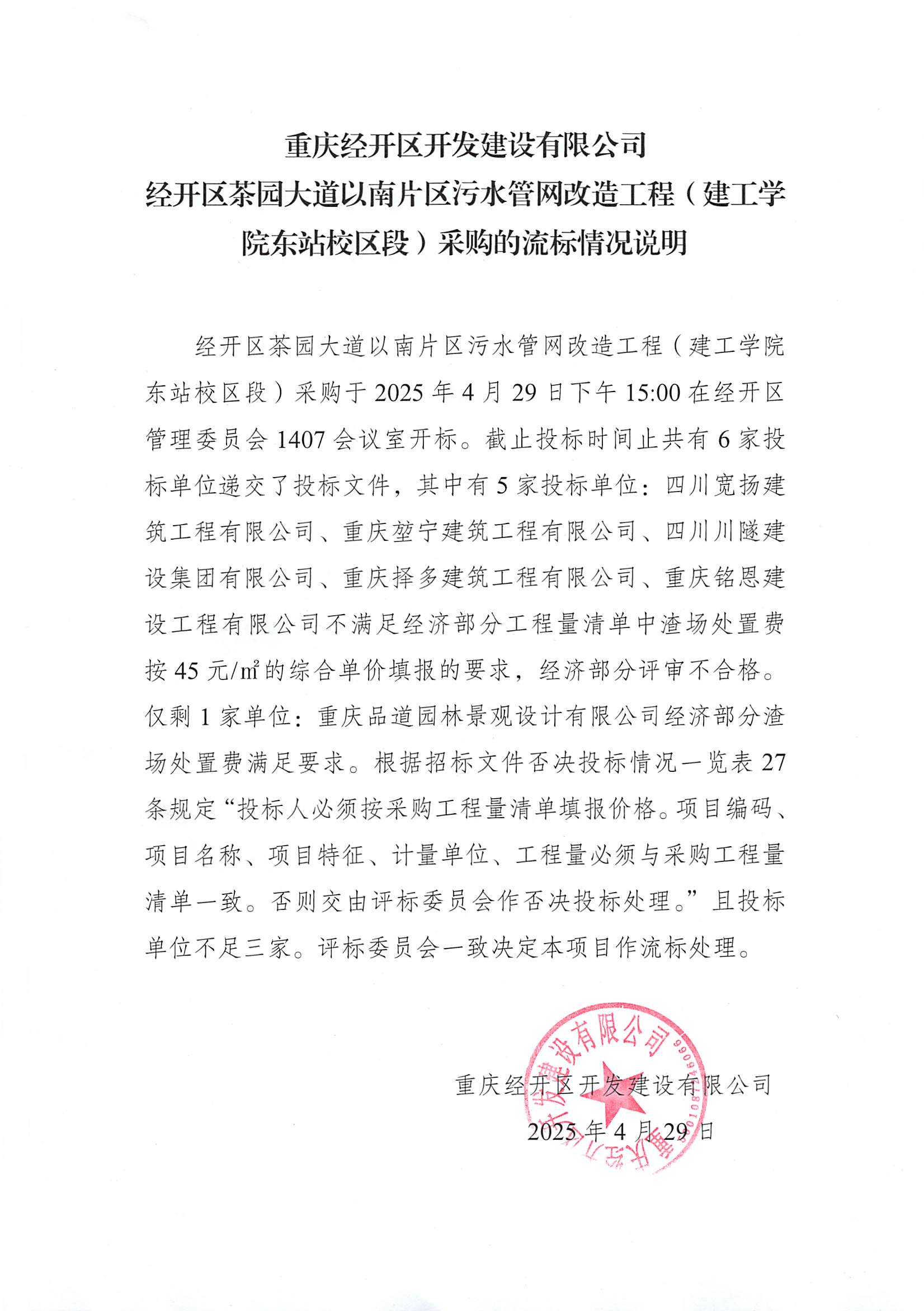 经开区茶园大道以南片区污水管网改造工程(建工学院东站校区段)采购的流标情况说明