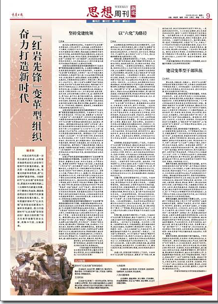红岩精神是重庆鲜明的红色标识和精神符号。全面建设社会主义现代化新重庆,要大力实施“红岩精神”传承弘扬工程,奋力打造新时代“红岩先锋”变革型组织,并推动其在观念现代化、工作体系化、运行法治化、管理扁平化、平台数字化、能力实战化“六化”上下功夫,用红岩精神凝聚新重庆建设的强大力量。