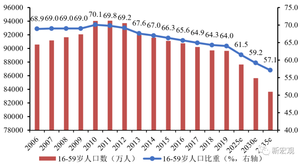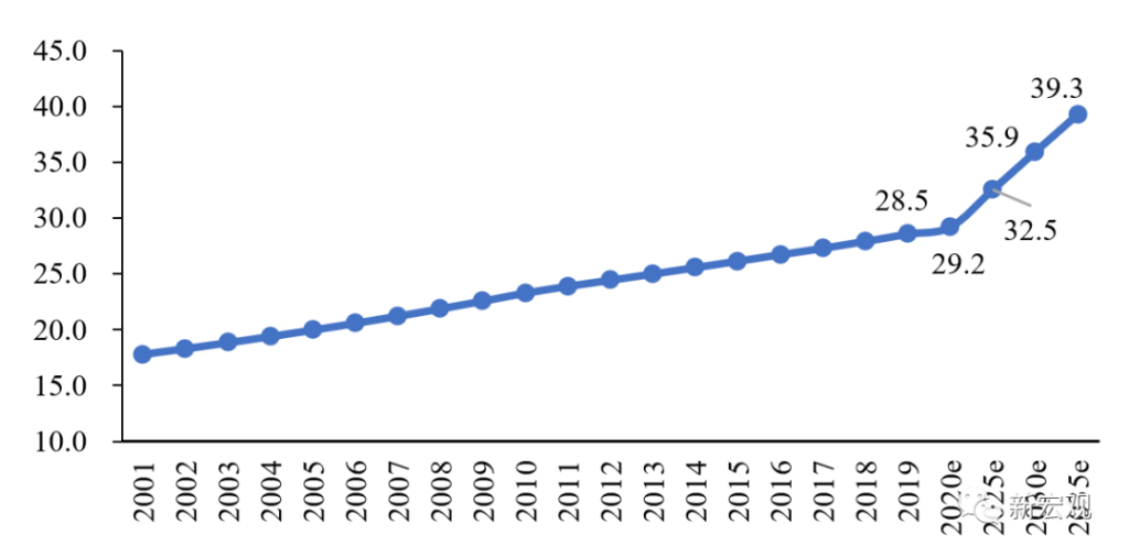 老龄化进入加速期,劳动力供给将继续下降。到2025年,预计我国60岁以上人口占比将达到20.5%,65岁以上人口占比将接近14.0%,劳动年龄人口将继续减少2000万人左右,比重下降至61.5%(见图7)。与之伴随的是,居民消费倾向降低,劳动力成本上升,居民储蓄率降低,养老、医疗等社会保障费用负担加重。“十四五”仍是我国金融风险易发多发期,地方政府隐性债务风险将进一步显现,风险释放的压力将持续增大。此次新冠肺炎疫情也暴露出了我国医疗卫生体系、社会管理、应急管理等方面诸多短板和问题,将成为“十四五”时期补短板的重点。