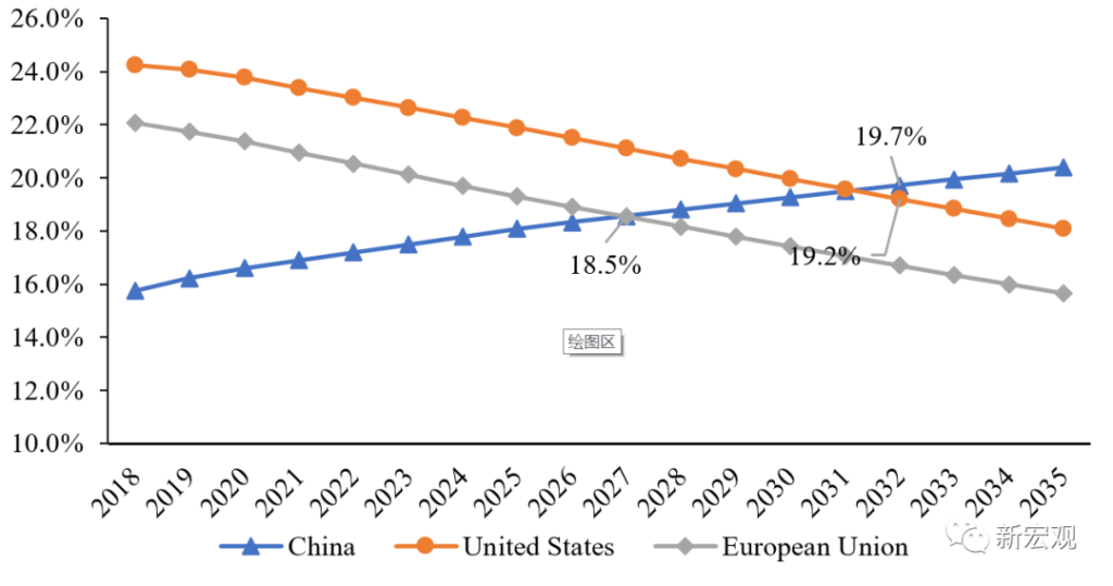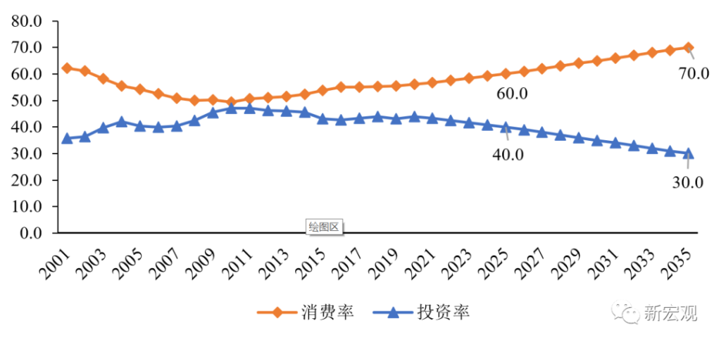 “十四五”时期我国将大概率进入高收入经济体行列。据测算,到2024年底我国人均国民收入可超过14000美元(见图2),将迈过高收入门槛线。此次疫情将加速经济进入中速增长平台的进程,并带动增长中枢进一步下调,“十四五”时期年均增速将下降至5.0%~5.5%左右(见图3)。我国经济总量将更加接近美国并逐步实现赶超,“十四五”末期中美经济总量的差距将显著缩小,并将在2027年超过欧盟,在2032年超过美国(见图4)。经济结构将进一步优化,创新引领特征强化,消费需求仍将是带动经济的主要力量。“十四五”时期我国消费率将由2019年的55.4%上升至60%左右,投资率将由2019年的43.1%下降至40%左右(见图5)。我国不断累积的人力资本和不断提高的科技创新能力,将成为“十四五”时期经济发展的重要驱动力,创新引领经济发展的特征更趋明显。