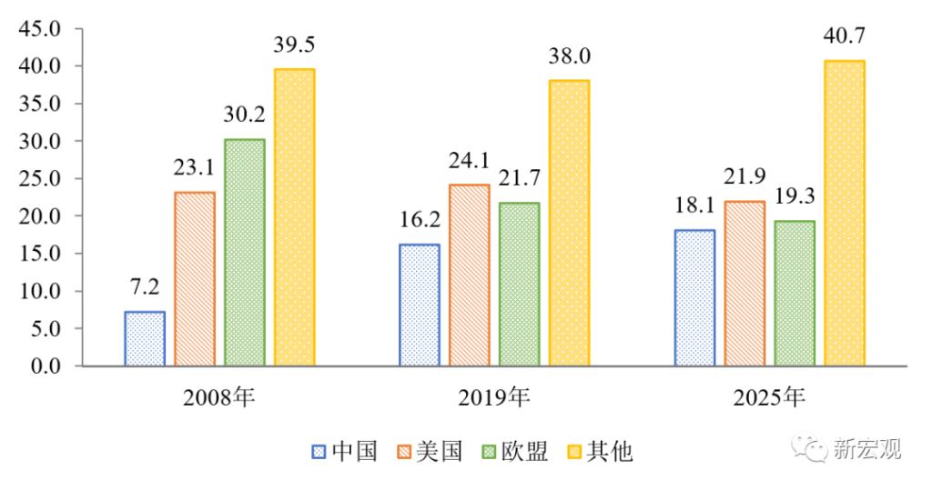 预计“十四五”期间,世界经济总体上呈现中国份额明显提高、美国相对稳定、欧盟显著下降的格局(见图1),中、美、欧经济占比将分别达到18.1%、21.9%和19.3%。新一代信息技术进一步深化了全球产业链网络化布局,全球产业链、价值链、供应链布局由成本至上转向成本、市场、安全等多因素并重。主要经济体、跨国公司预计将进一步调整其产业布局,在“市场开放优势”与“国家安全需要”之间找寻新的平衡,进一步增强其产业安全性和抗风险能力。全球产业链供应链分散化、多中心化趋势进一步加强,北美、欧洲、东亚三大生产网络的内部循环强化,原有的“大三角循环”分工格局将发生重大调整。
